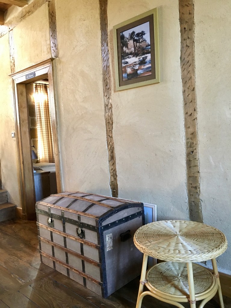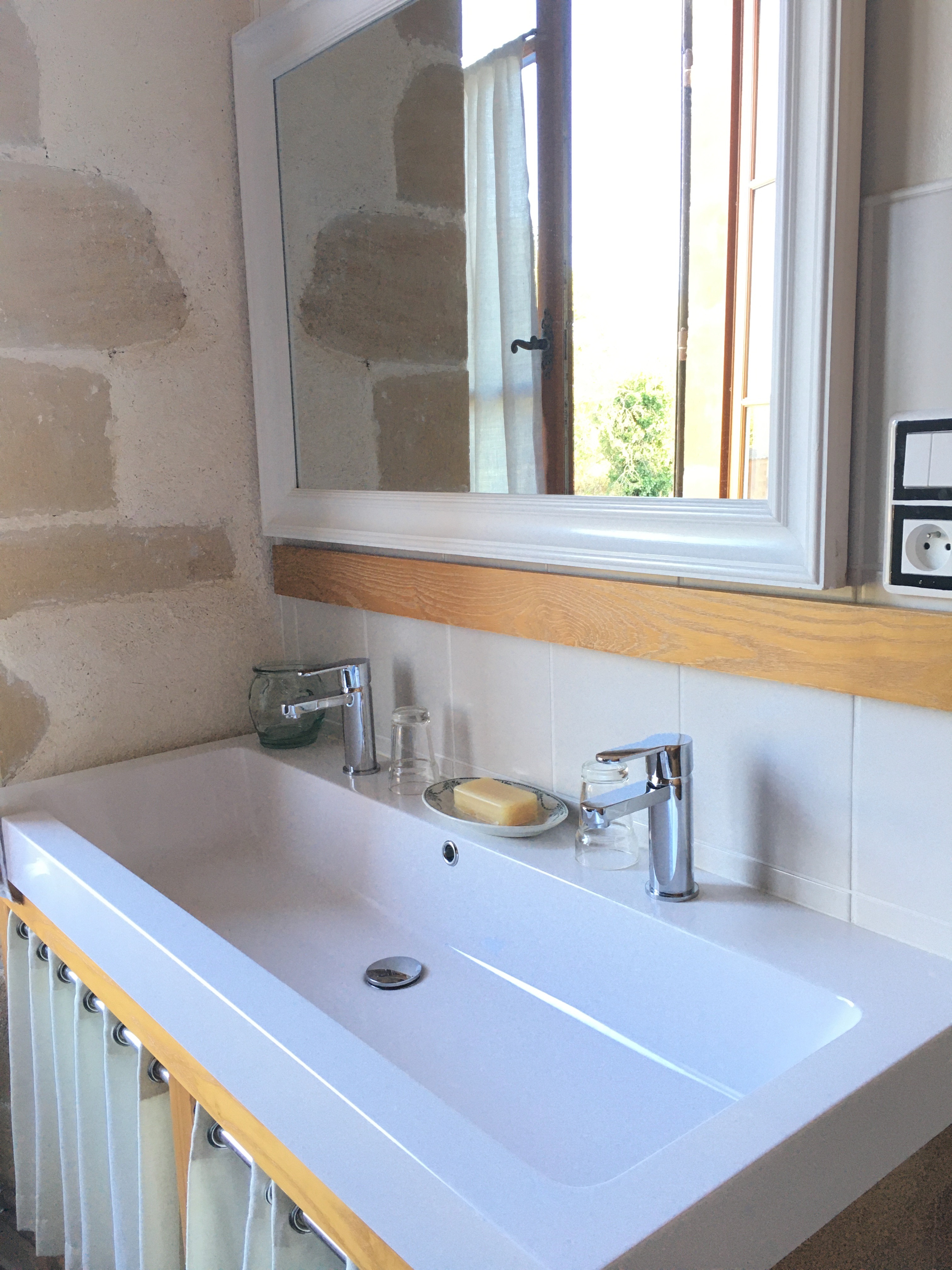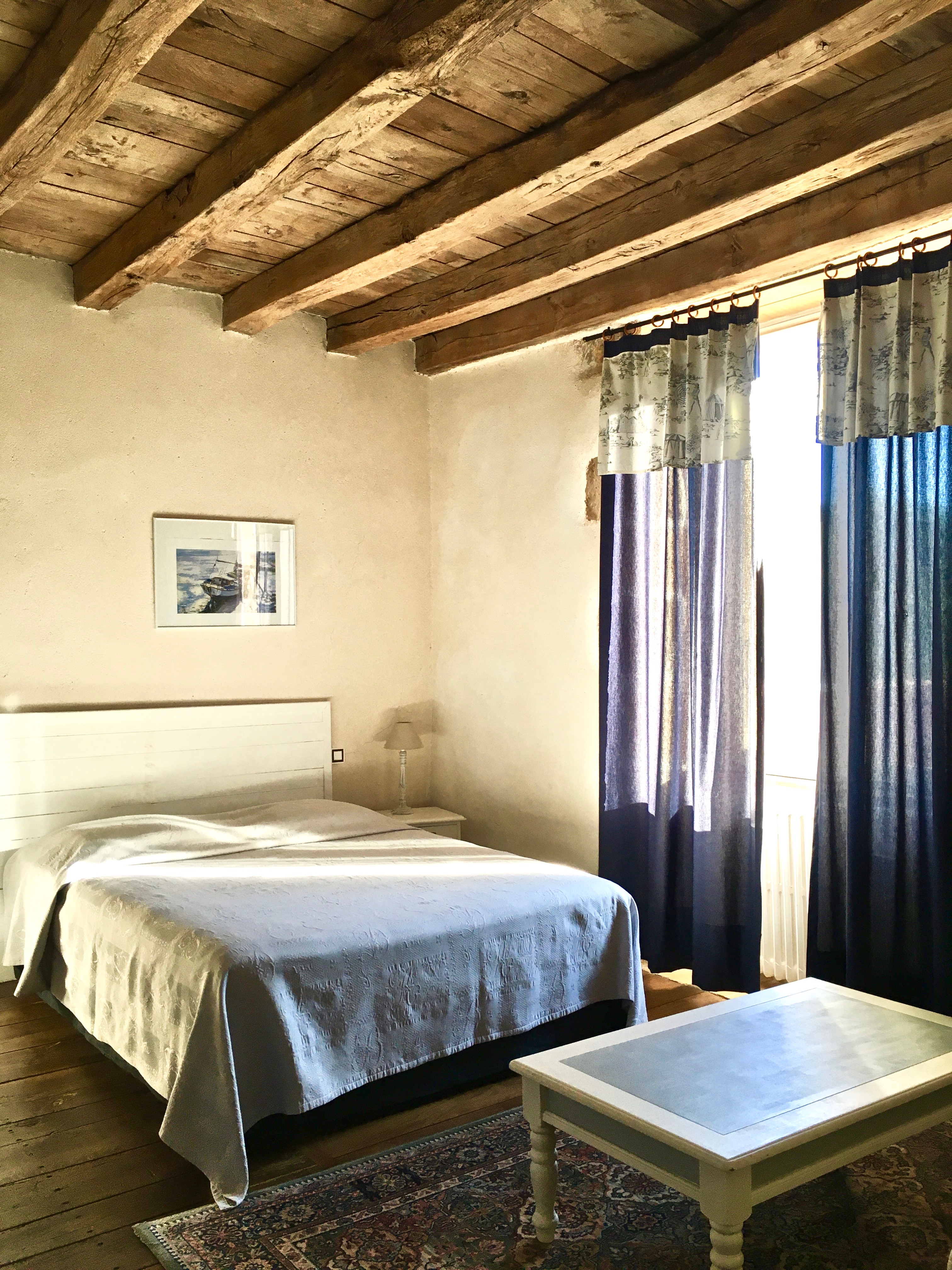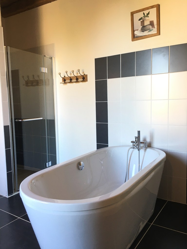 À l’étage, deux chambres avec un lit double (160×200), une chambre avec quatre lits (90x200cm). Une grande salle de bain avec baignoire, douche italienne, lavabo double et WC indépendant. Toute la literie provient de notre fournisseur local « Duvivier ».