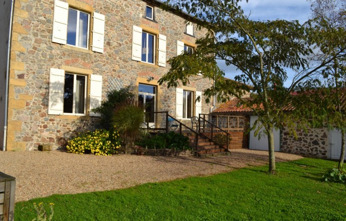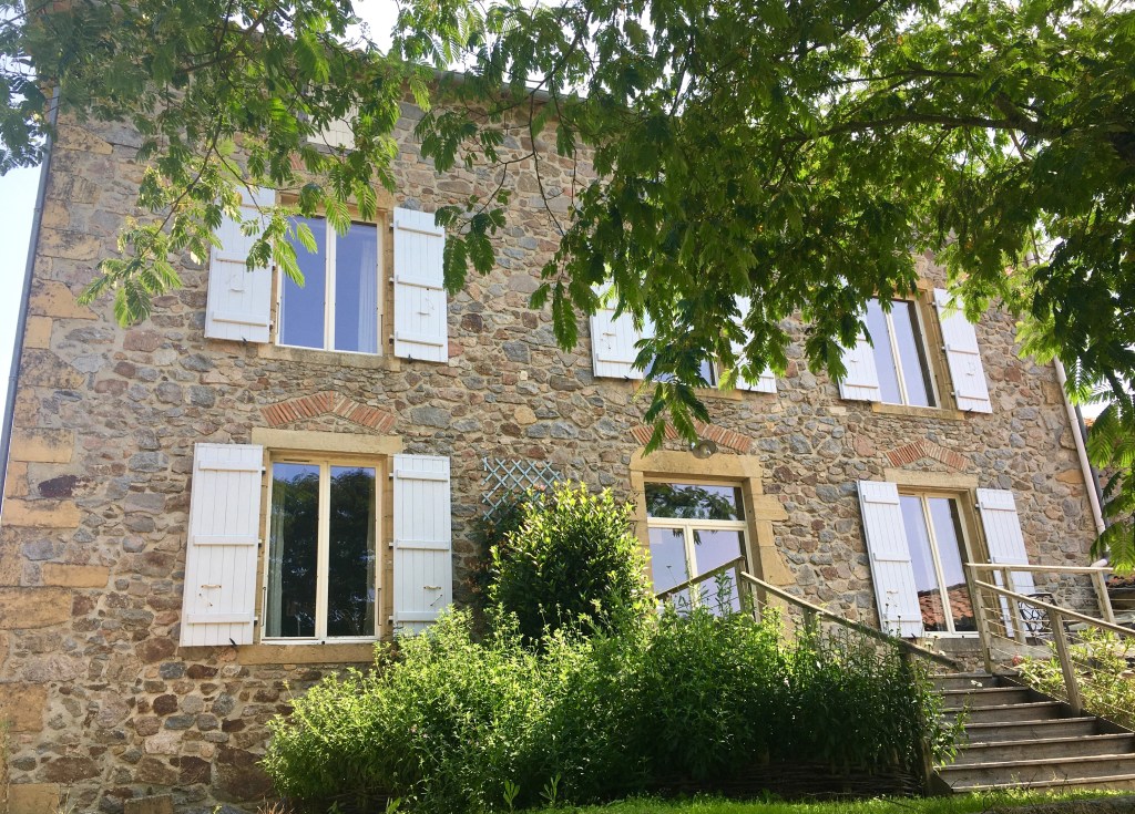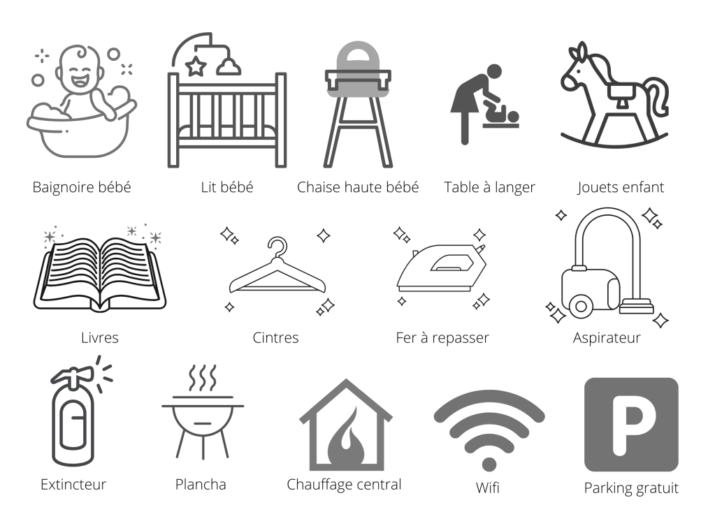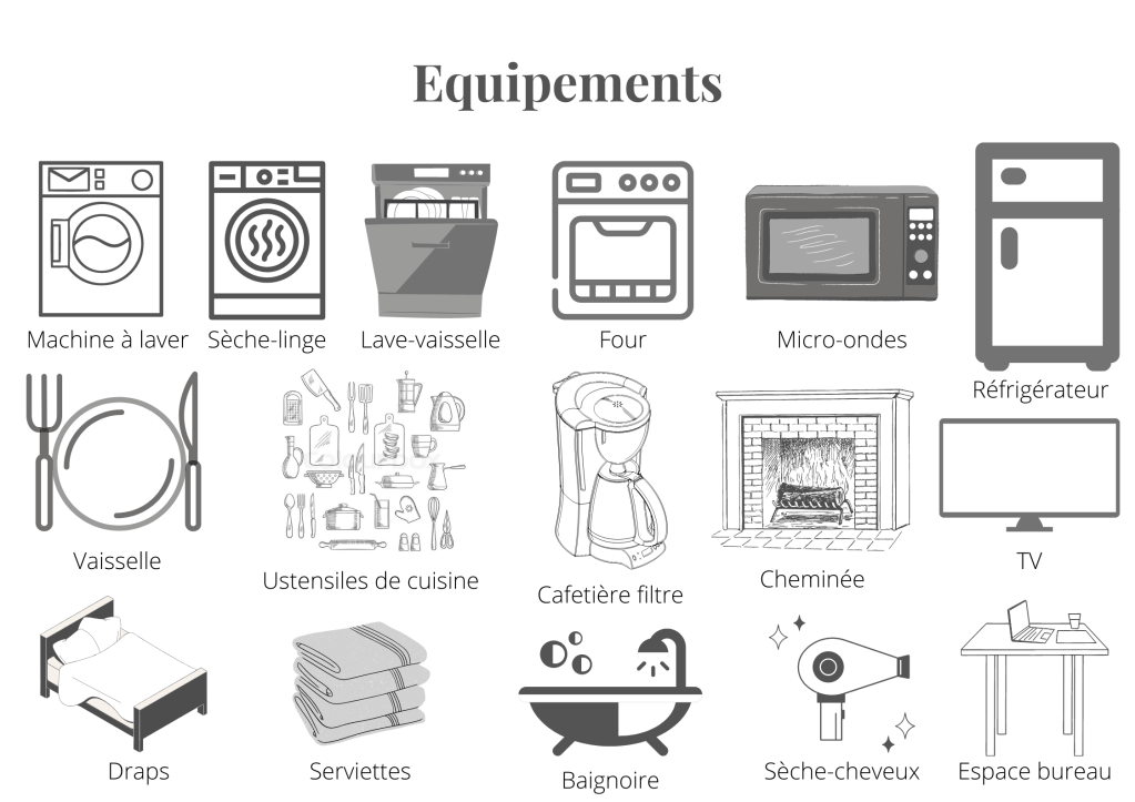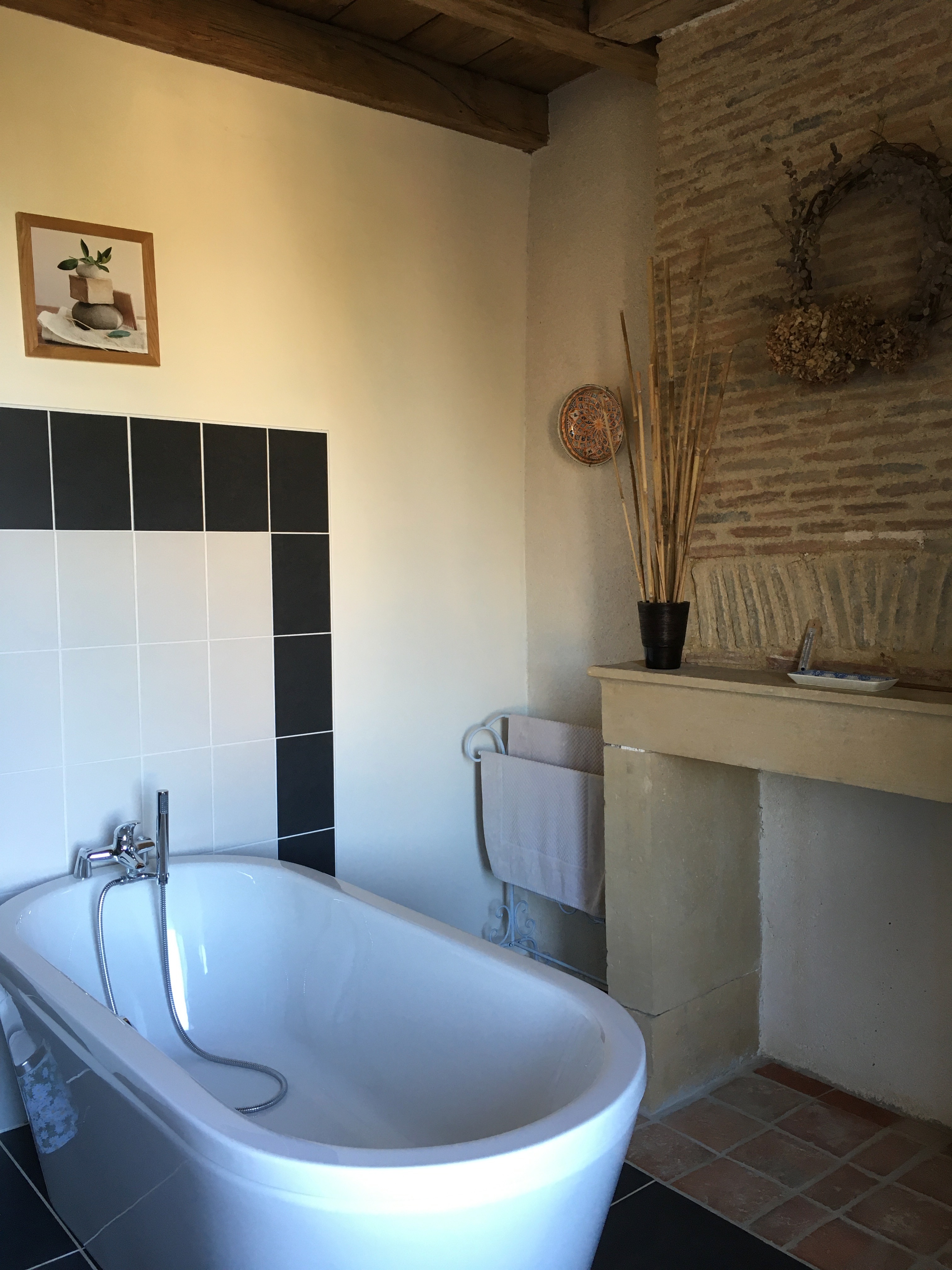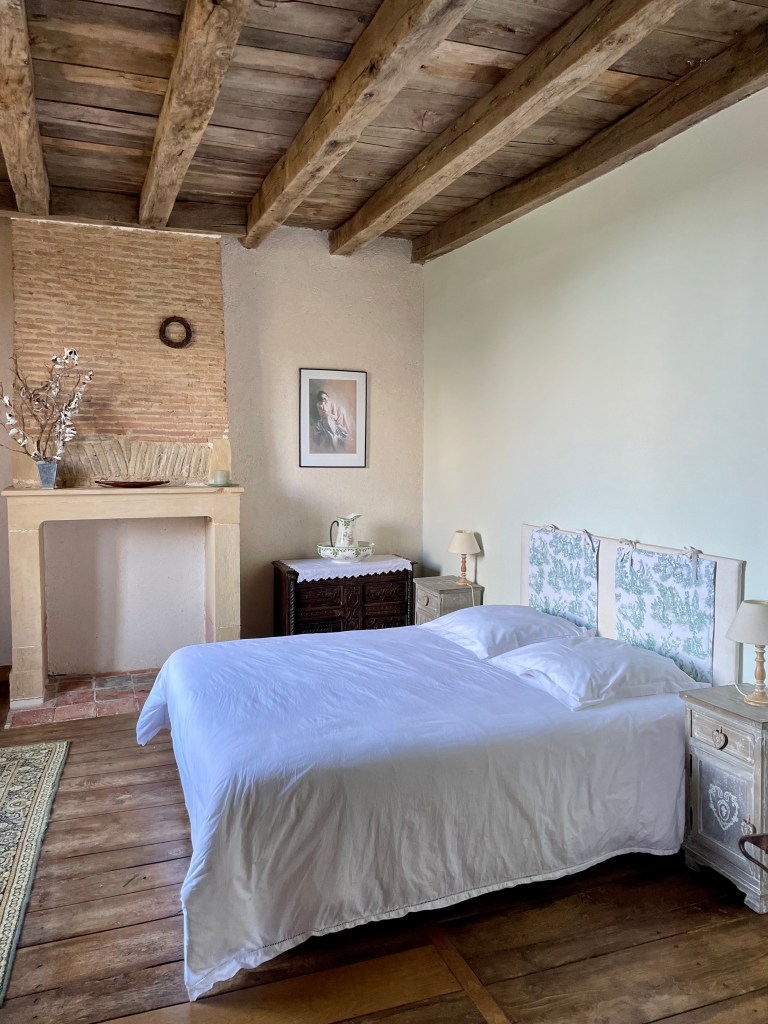 À l’étage, deux chambres avec un lit double (160×200), une chambre avec quatre lits (90x200cm). Une grande salle de bain avec baignoire, douche italienne, lavabo double et WC indépendant. Toute la literie provient de notre fournisseur local « Duvivier ».